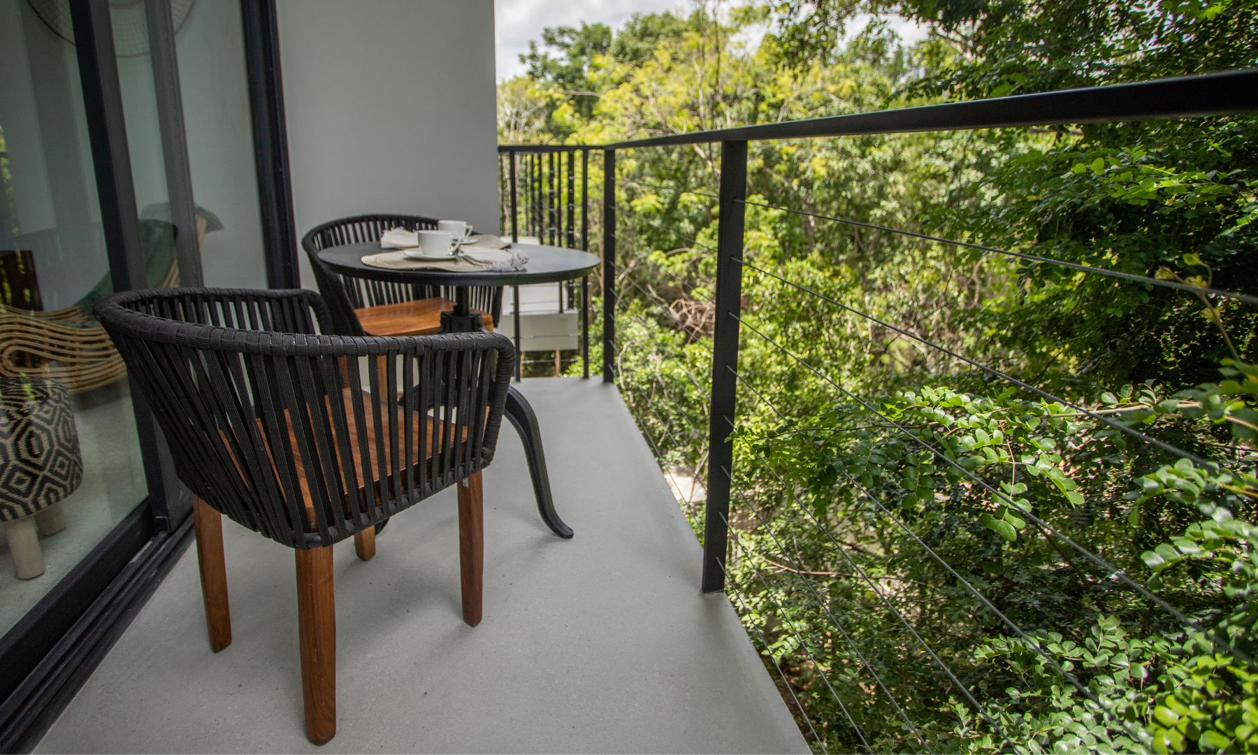 Combinación de tonos mas oscuros en textiles y maderas autóctonas, a través del mobiliario y los materiales se conecta con un grandioso entorno verde.