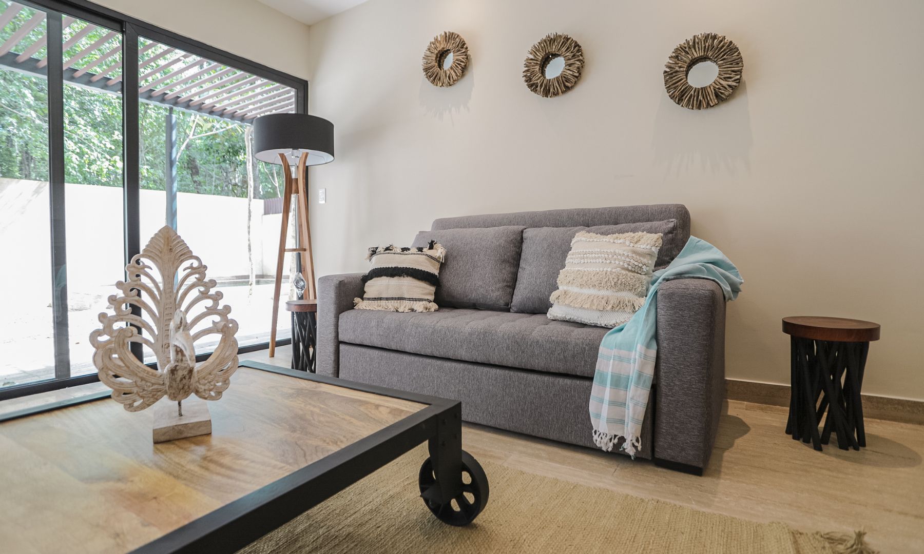 Tonos neutros, detalles en color turquesa, simetrías y asimetrías se combinan, resaltando los juegos de luz de la obra, la claridad de los muros y las posibles diferentes configuraciones de los espacios.