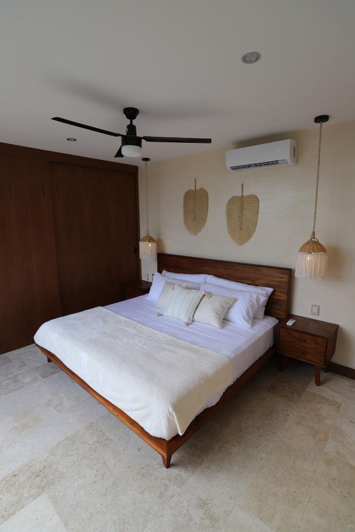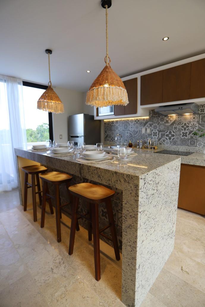 El apartamento cobra vida con muebles de madera de tzalam, resonando la autenticidad de la región.