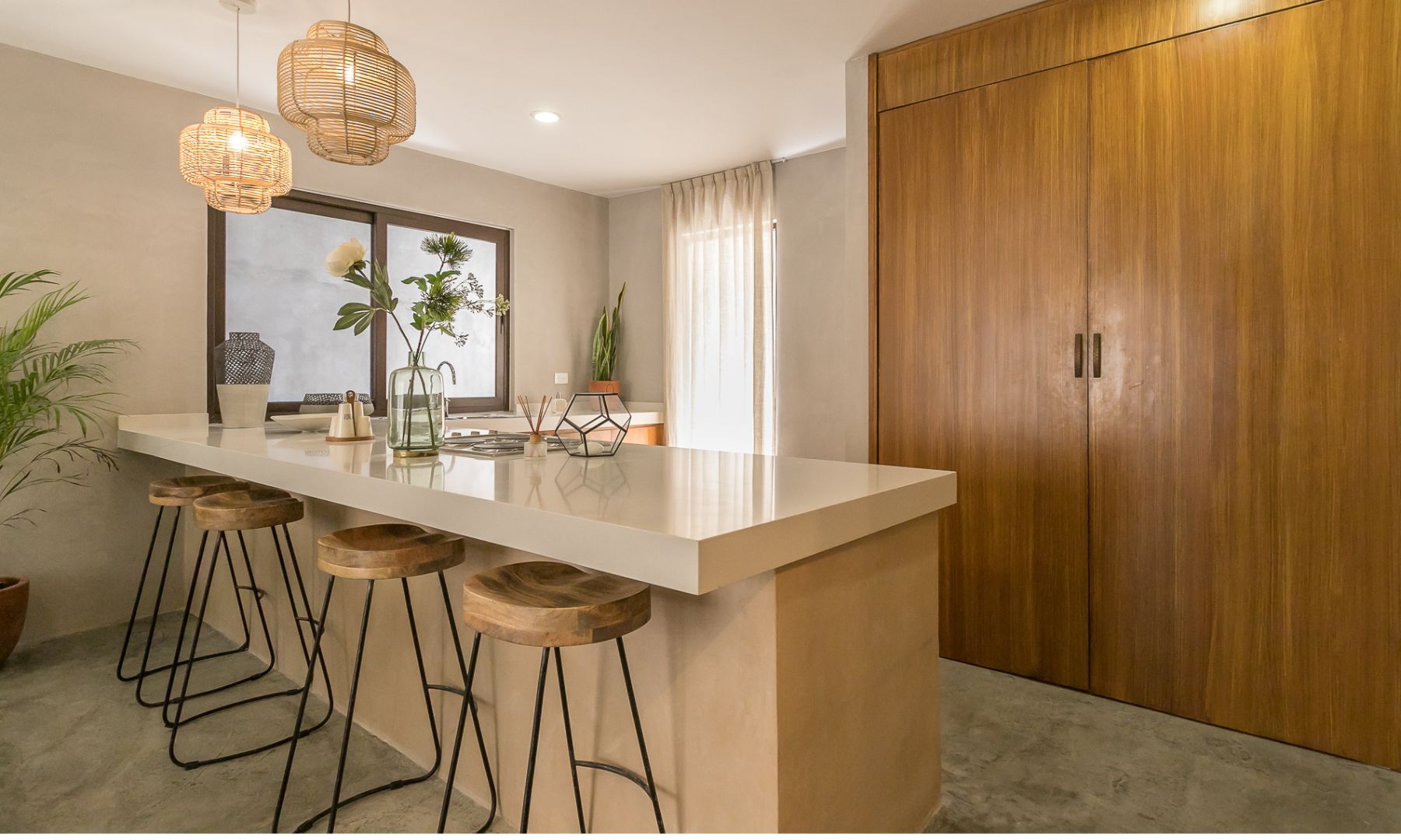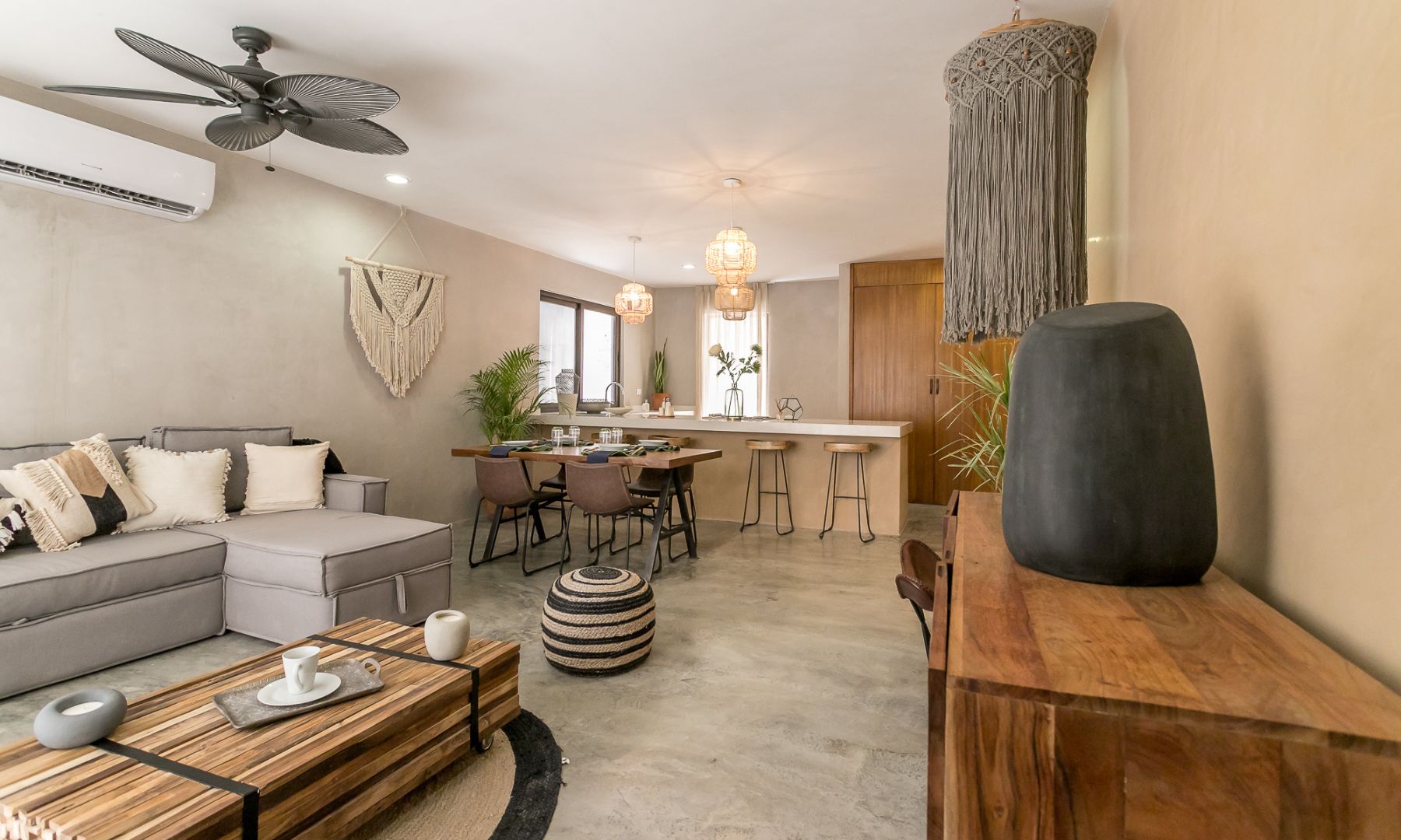 Proyecto con detalles artesanales. Textiles, maderas, fibras se combinan para dar una estética muy relajante y natural, combinando elementos de fabricación e importados, logramos un espacio muy acogedor.